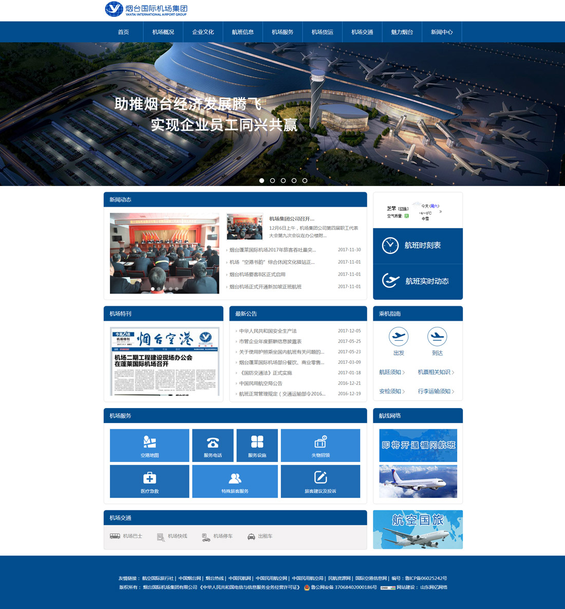 公司介绍:烟台国际机场集团有限公司成立于2004年底,是在原民航烟台莱山机场的基础上组建成立,为烟台市政府直属国有独资企业。2015年5月28日,机场集团公司转场至蓬莱国际机场。新机场飞行区等级为4E级,跑道长3400米,国际、国内候机楼面积9万平方米,停机坪占地面积40万平方米,拥有39个停机位,可满足波音747等大型飞机安全起降,为国家一类航空口岸。